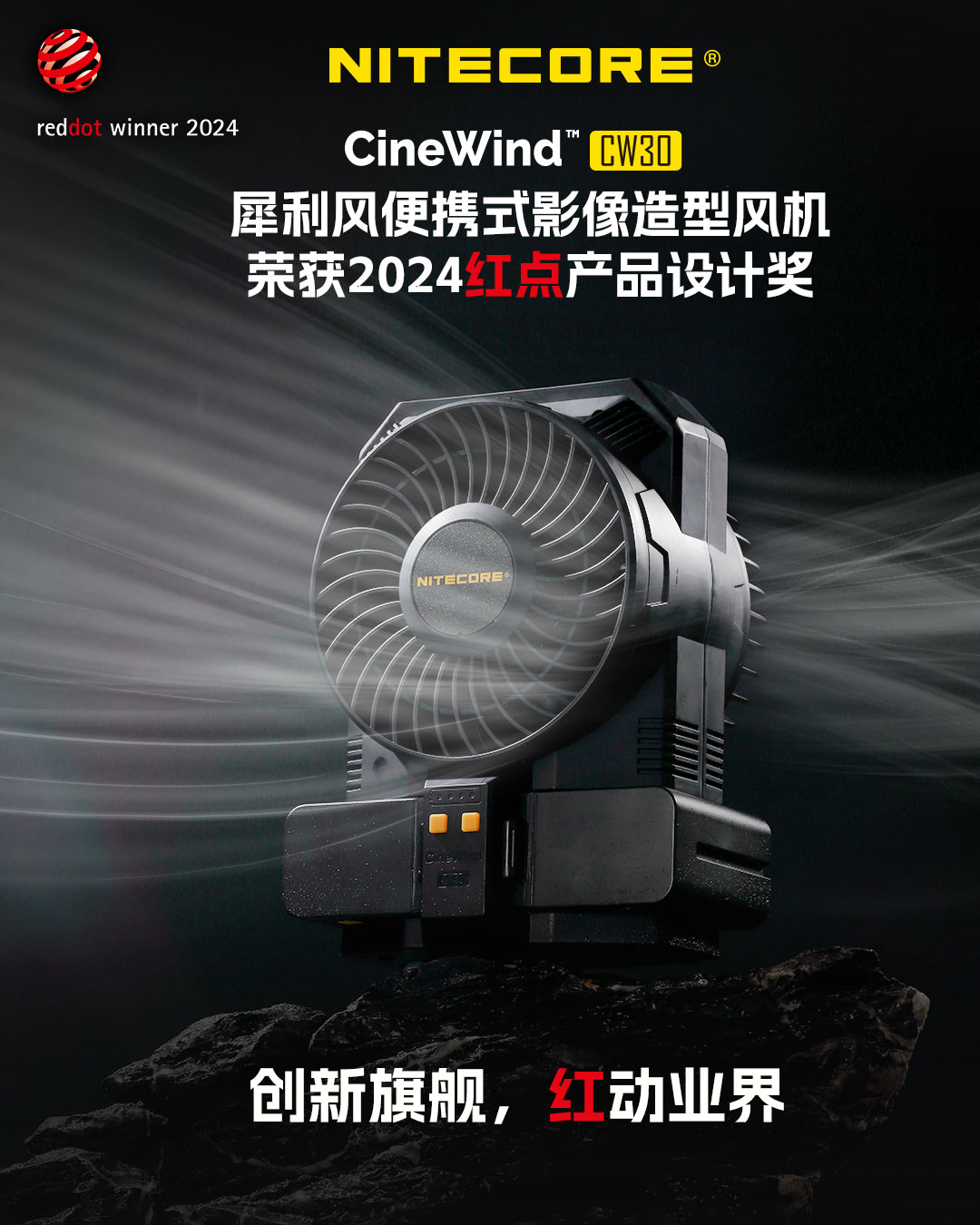行业新锐,一举夺红!在前不久结束的2024德国红点奖年度评选中(Red Dot Award),NITECORE奈特科尔CineWind™ CW30犀利风便携式影像造型风机以创新的设计,夺得「2024红点奖产品设计奖」。