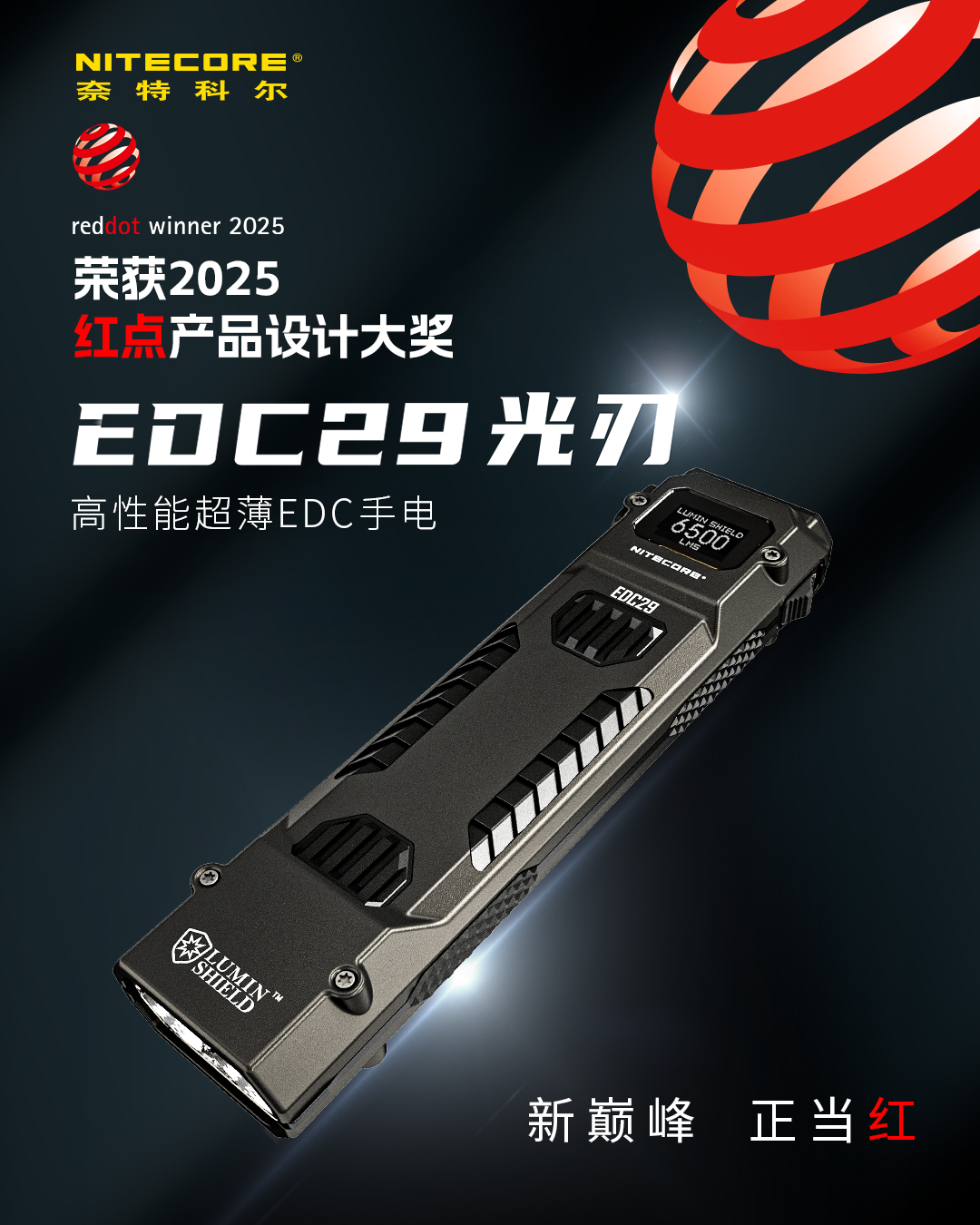 EDC29「光刃」高性能超薄EDC手电,全场景全方位控光,以6500流明与400米远射等一系列颠覆手电性能的创新设计,获得了红点奖的高度评价:“坚固且拥有丰富细节,一款多场景适用的精密实用型手电”,2025一举夺红,再登行业新高峰!