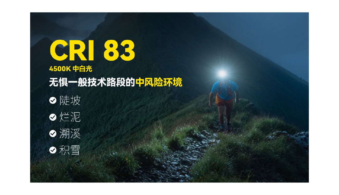 · 4500K中白光(CRI≥83)——应对中风险户外场景,如陡坡、烂泥、溯溪、积雪路段