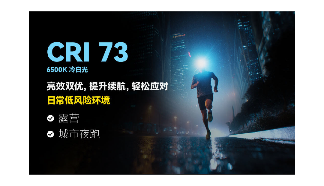 · 6500K冷白光(CRI≥73)——应对低风险户外场景,如露营、城市夜跑