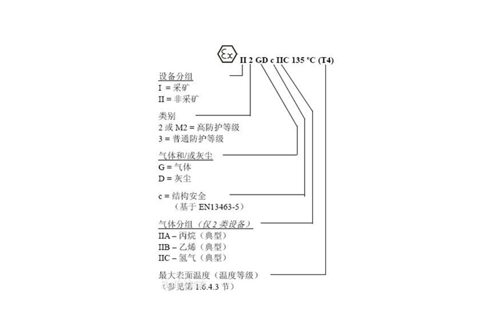 如果设备被用于0、1或2区,则类目数字后跟一字母G(气体、蒸气/薄雾):