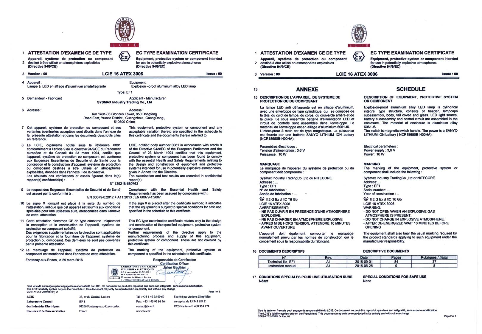 NITECORE奈特科尔的防爆照明系列产品获得法国中央电力电器实验室(LCIE)(2015年9月1日)及TÜV南德意志集团颁发的ATEX防爆认证(2018年9月24日)