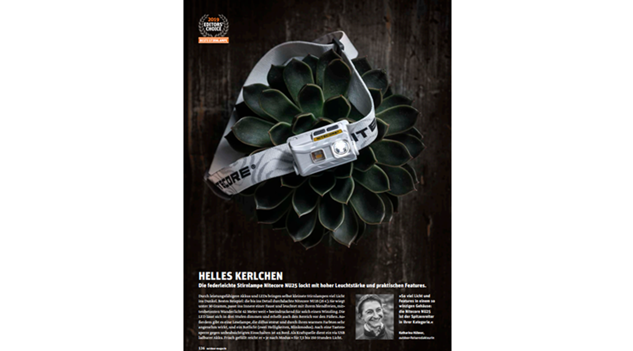 捷报!2019年2月,NITECORE奈特科尔得到德国权威户外媒体《OUTDOOR》杂志的肯定,斩获2019年最佳编辑推荐奖,牛头灯NU25被评选为2019度最佳头灯!