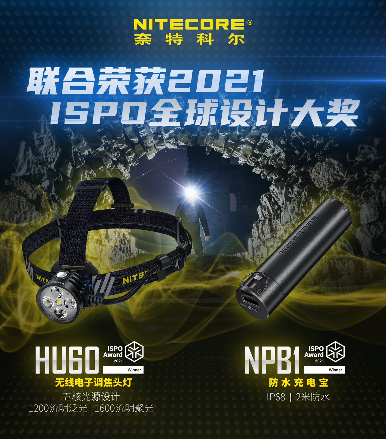 NITECORE奈特科尔HU60无线电子调焦头灯和NPB1防水充电宝联合荣获2021 ISPO全球设计奖!